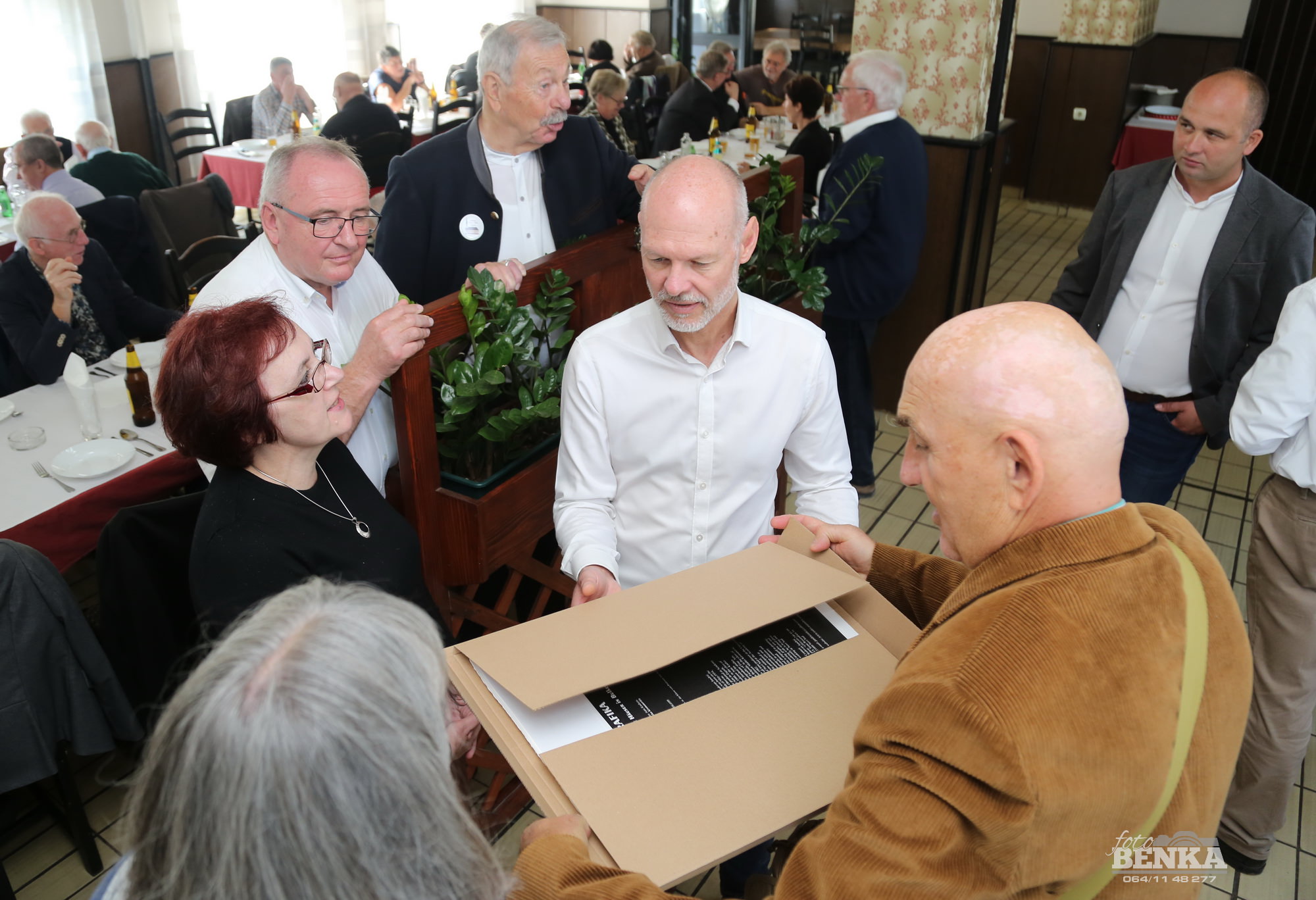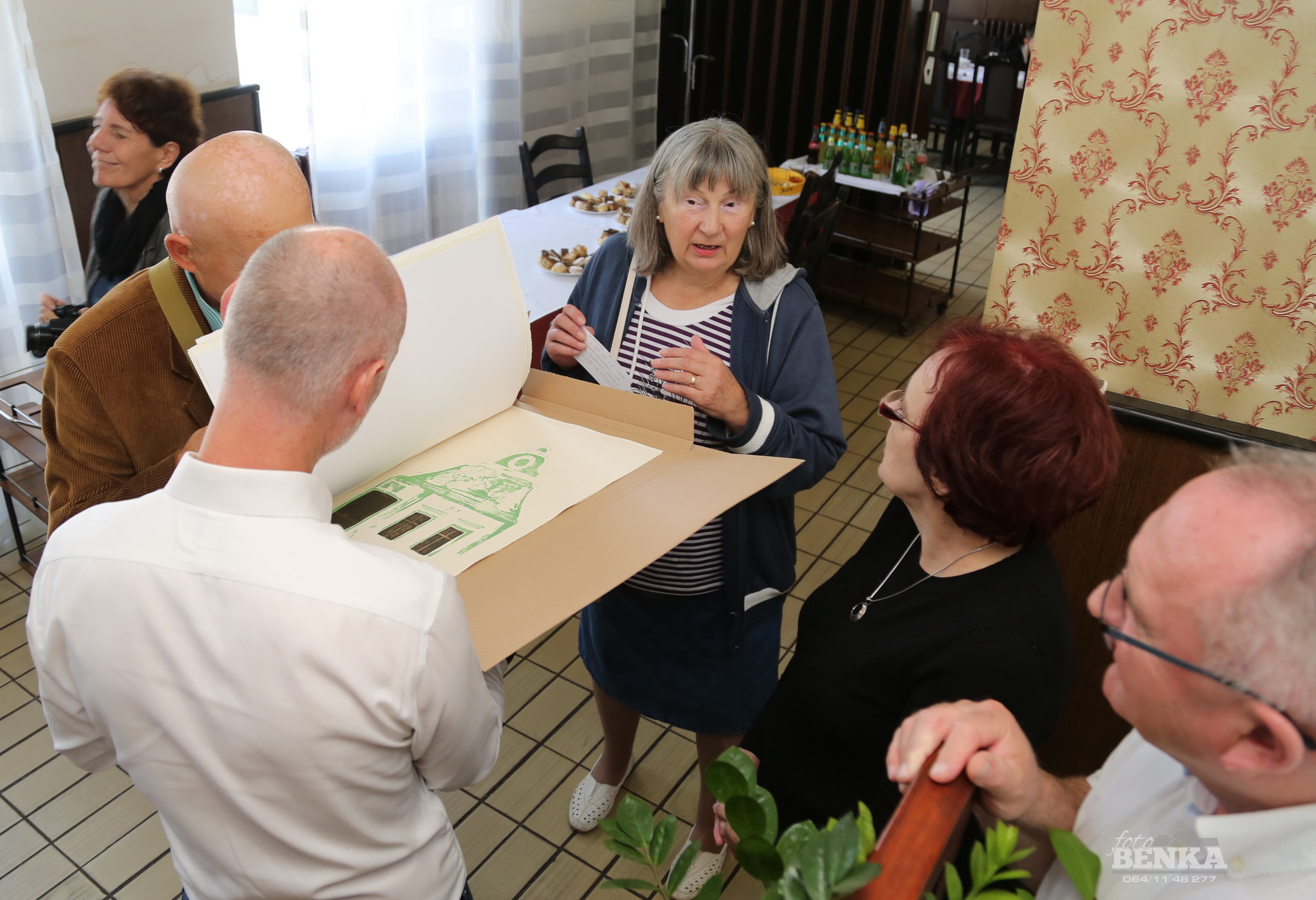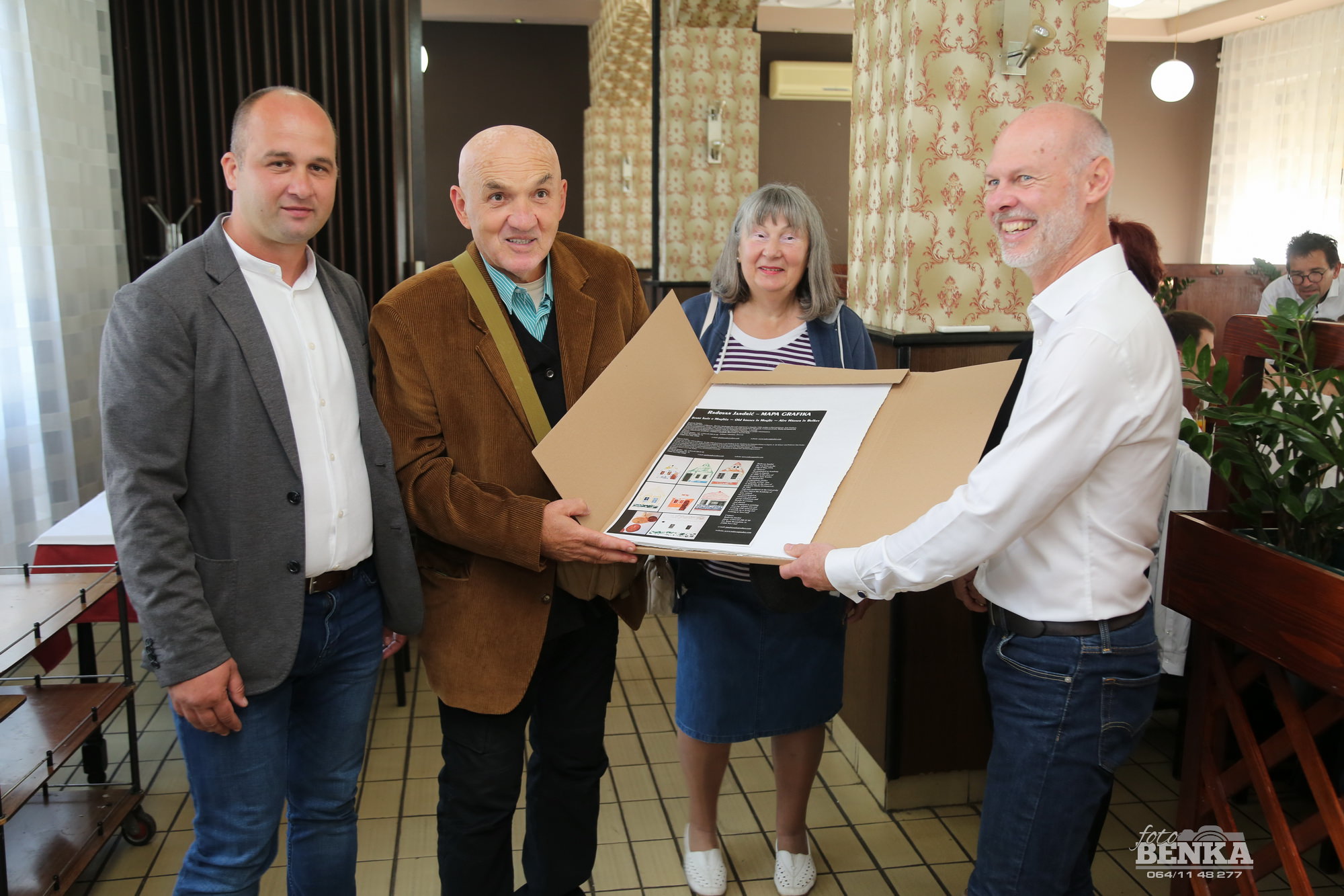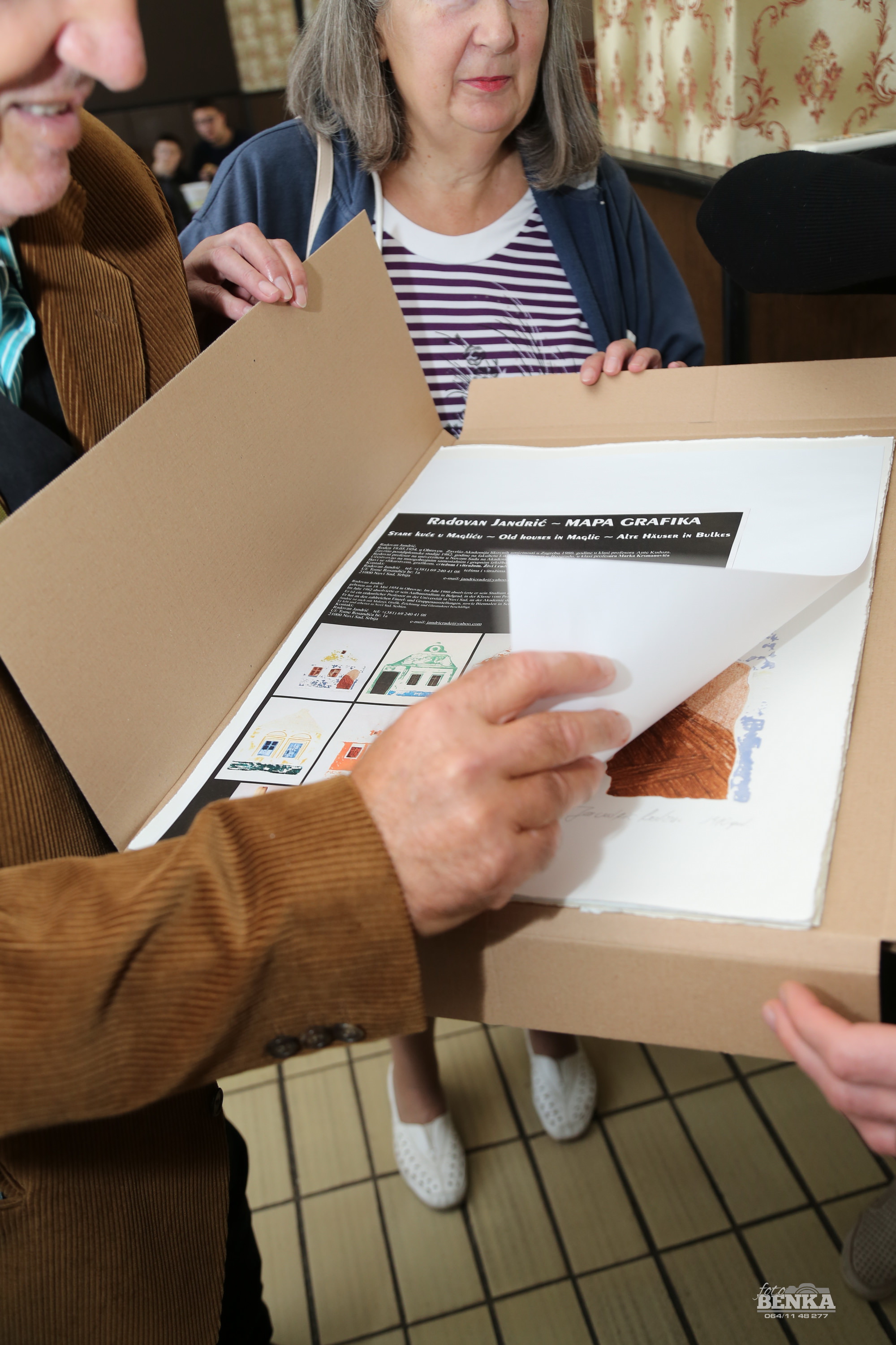 Oberbürgermeister Dr. Bader überreicht Frau Šproh ein Geschenk zum Fest. Der Künstler Radovan Jandrić aus Maglić überreicht eine Mappe mit Grafiken an OB Dr. Bader