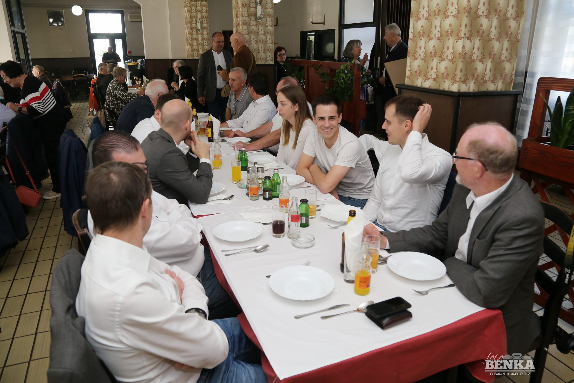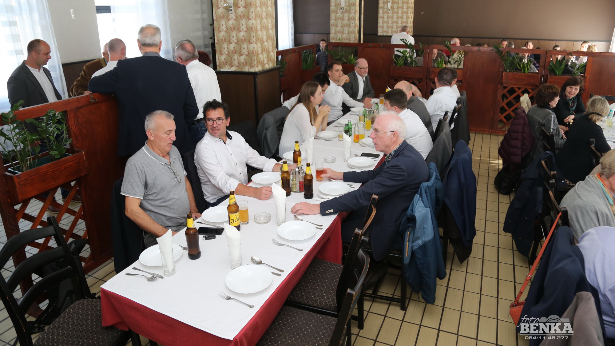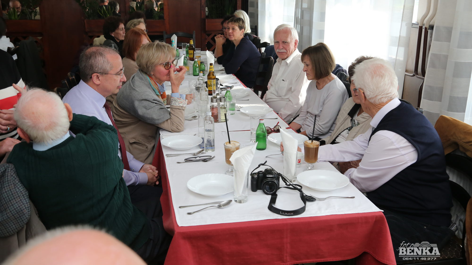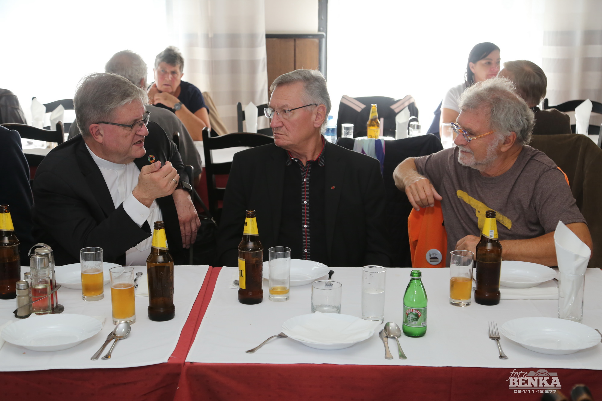 Oberbürgermeister Dr. Bader überreicht Frau Šproh ein Geschenk zum Fest. Der Künstler Radovan Jandrić aus Maglić überreicht eine Mappe mit Grafiken an OB Dr. Bader