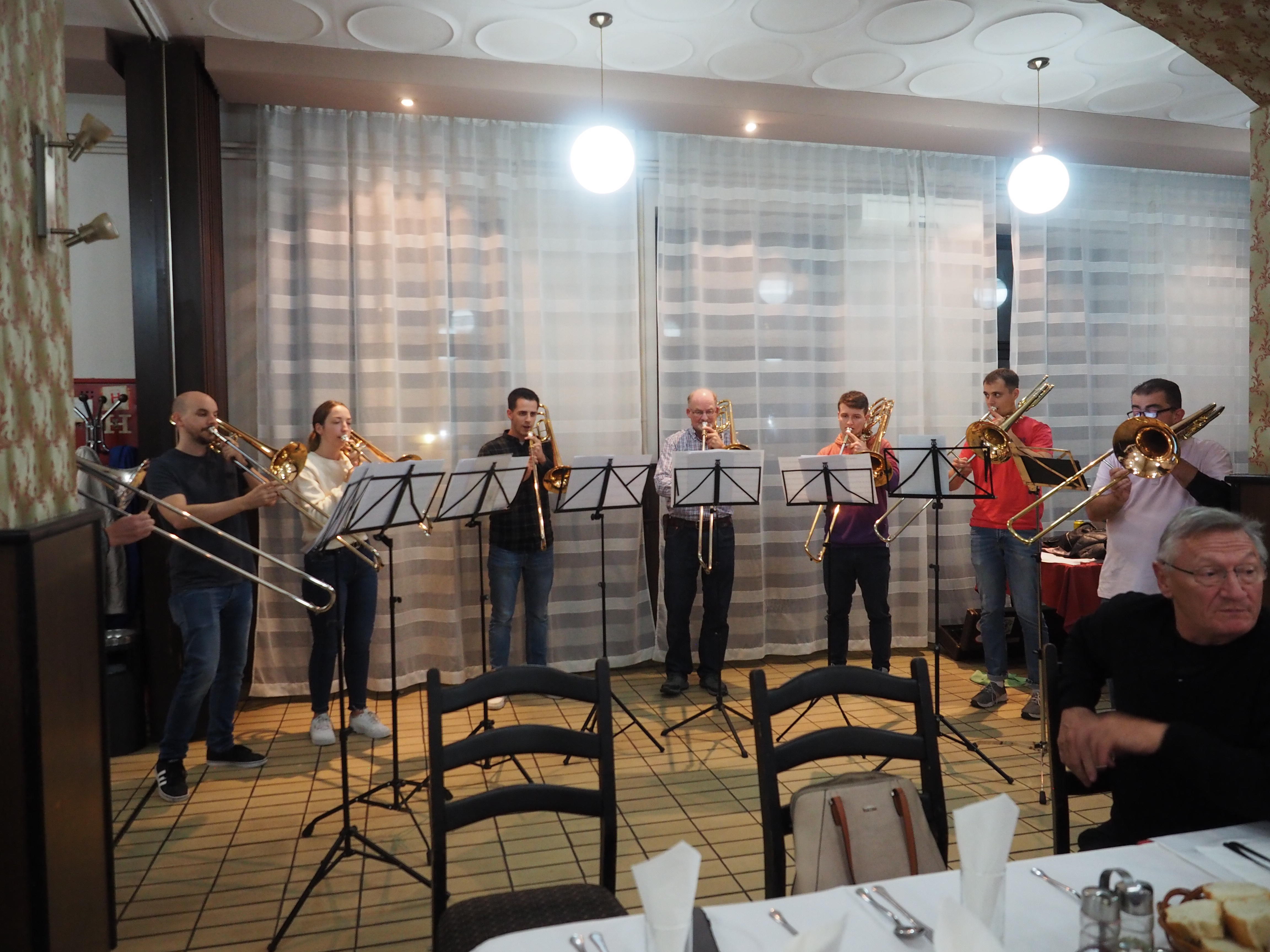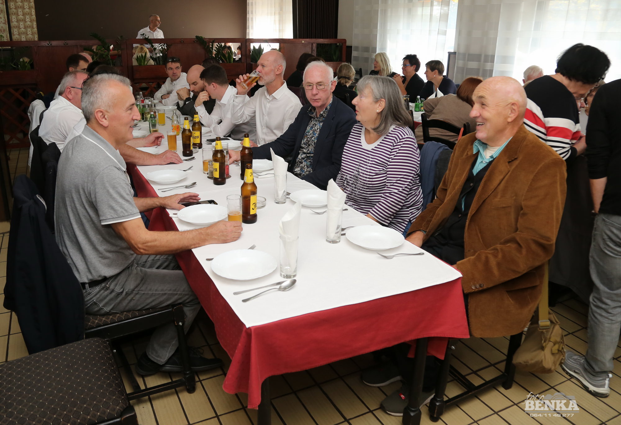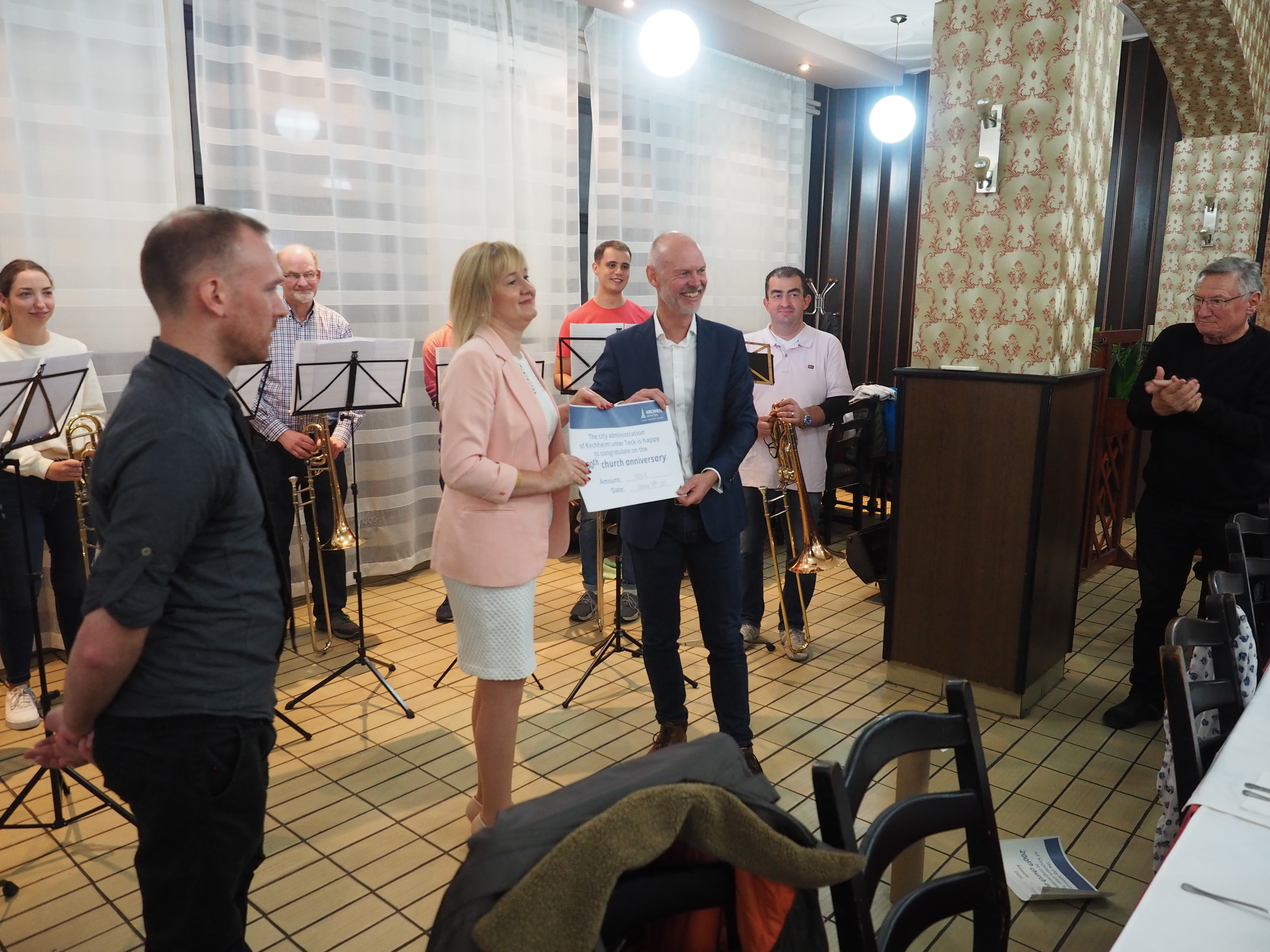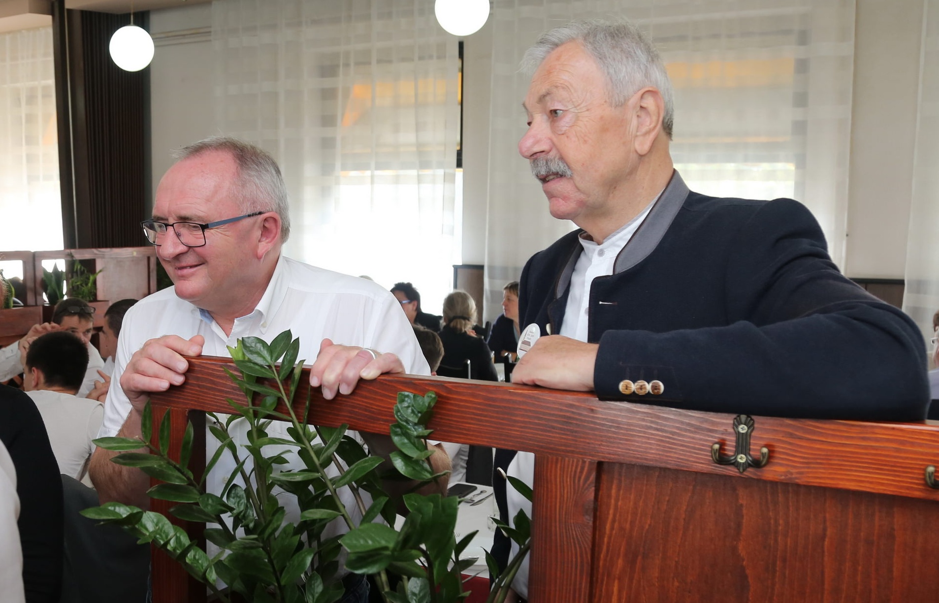 Oberbürgermeister Dr. Bader überreicht Frau Šproh ein Geschenk zum Fest. Der Künstler Radovan Jandrić aus Maglić überreicht eine Mappe mit Grafiken an OB Dr. Bader