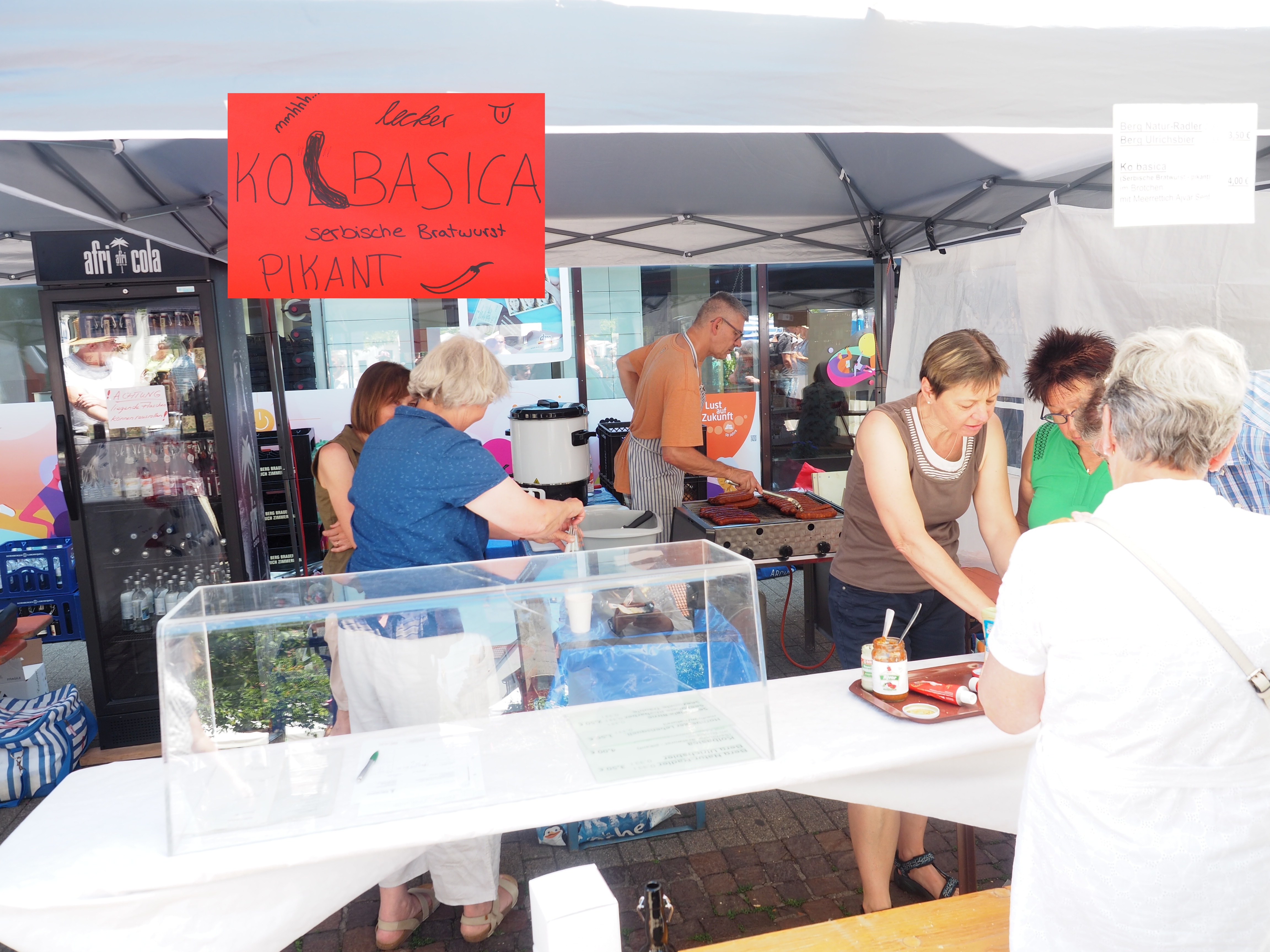 Der Förderverein Kirchheim - Bački Petrovac präsentierte sich mit einer serbisch/ungarischen und auch donauschwäbischen Spezialität. Eine feurige Paprikawurst (Kolbász) vom Grill kam bei unseren Gästen gut an. Besondere Gäste des Fördervereins waren Mitglieder unseres Partnervereins „Kulturzentrum Bulkes-Maglić“ Violeta Cvetković, Radomir Zotović, Duško Berat und Maja Vukašinović.