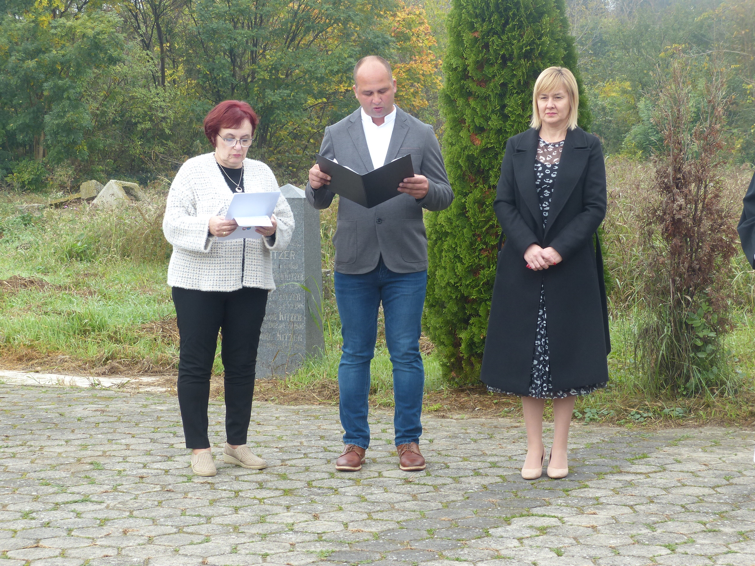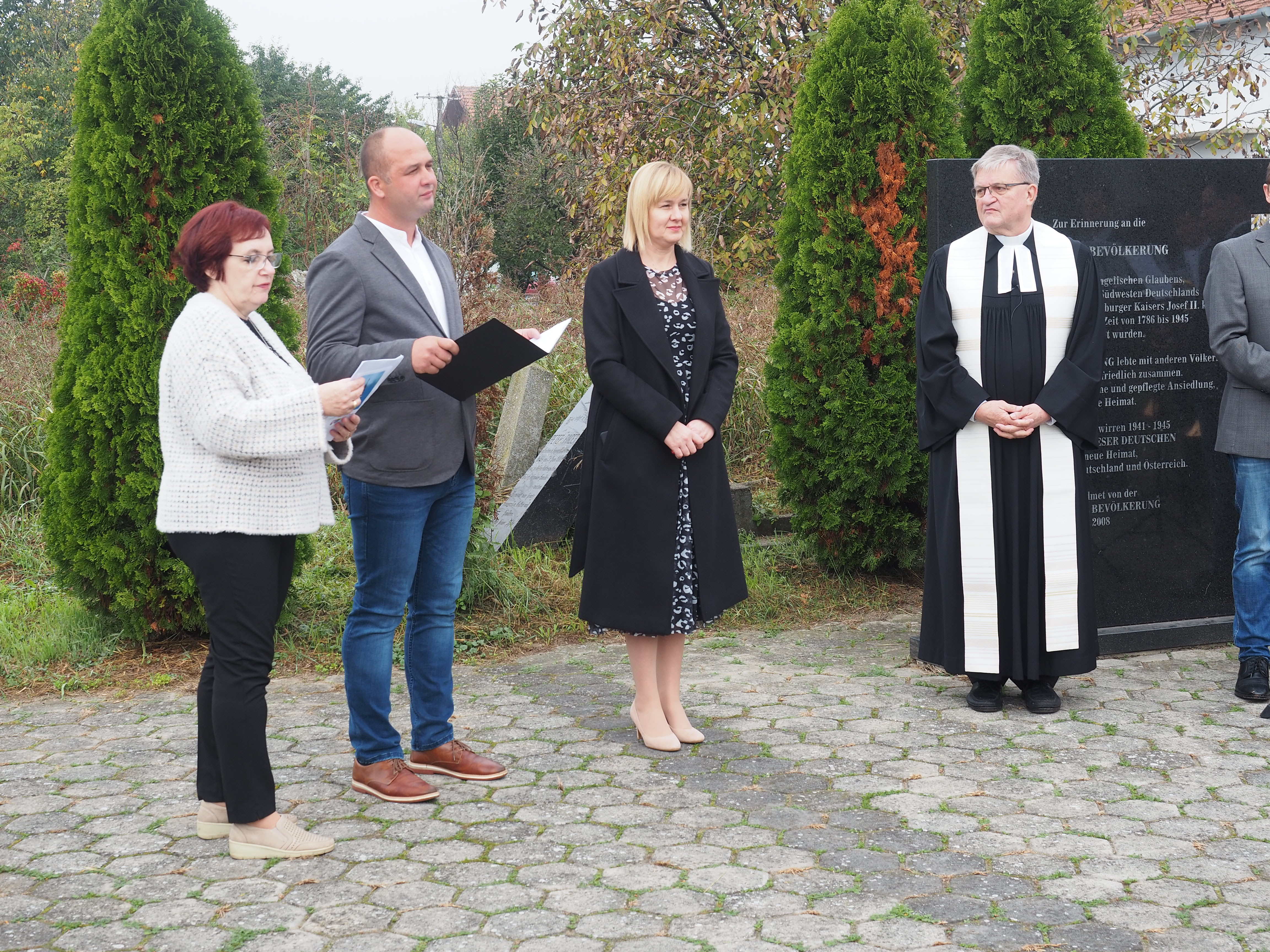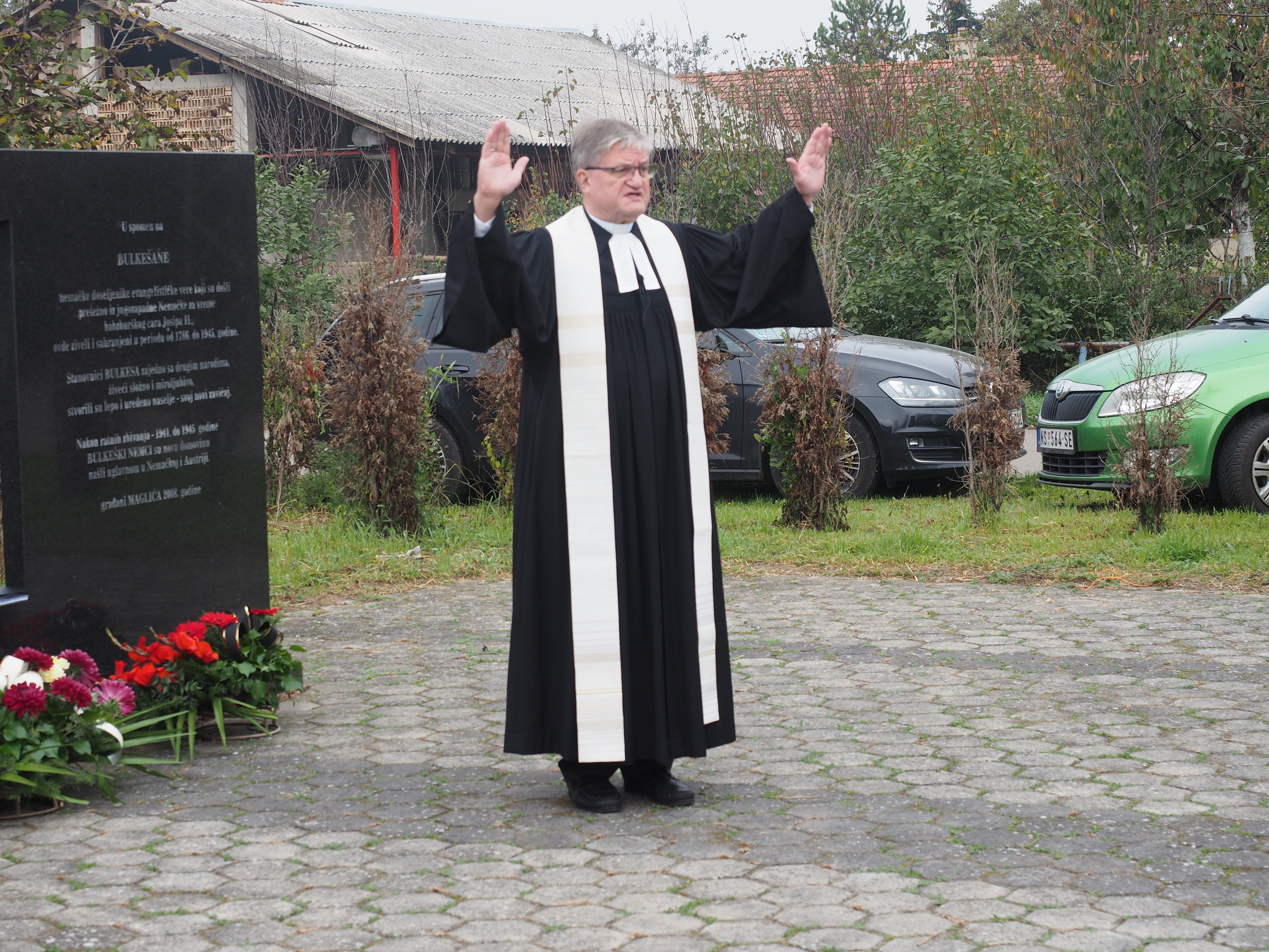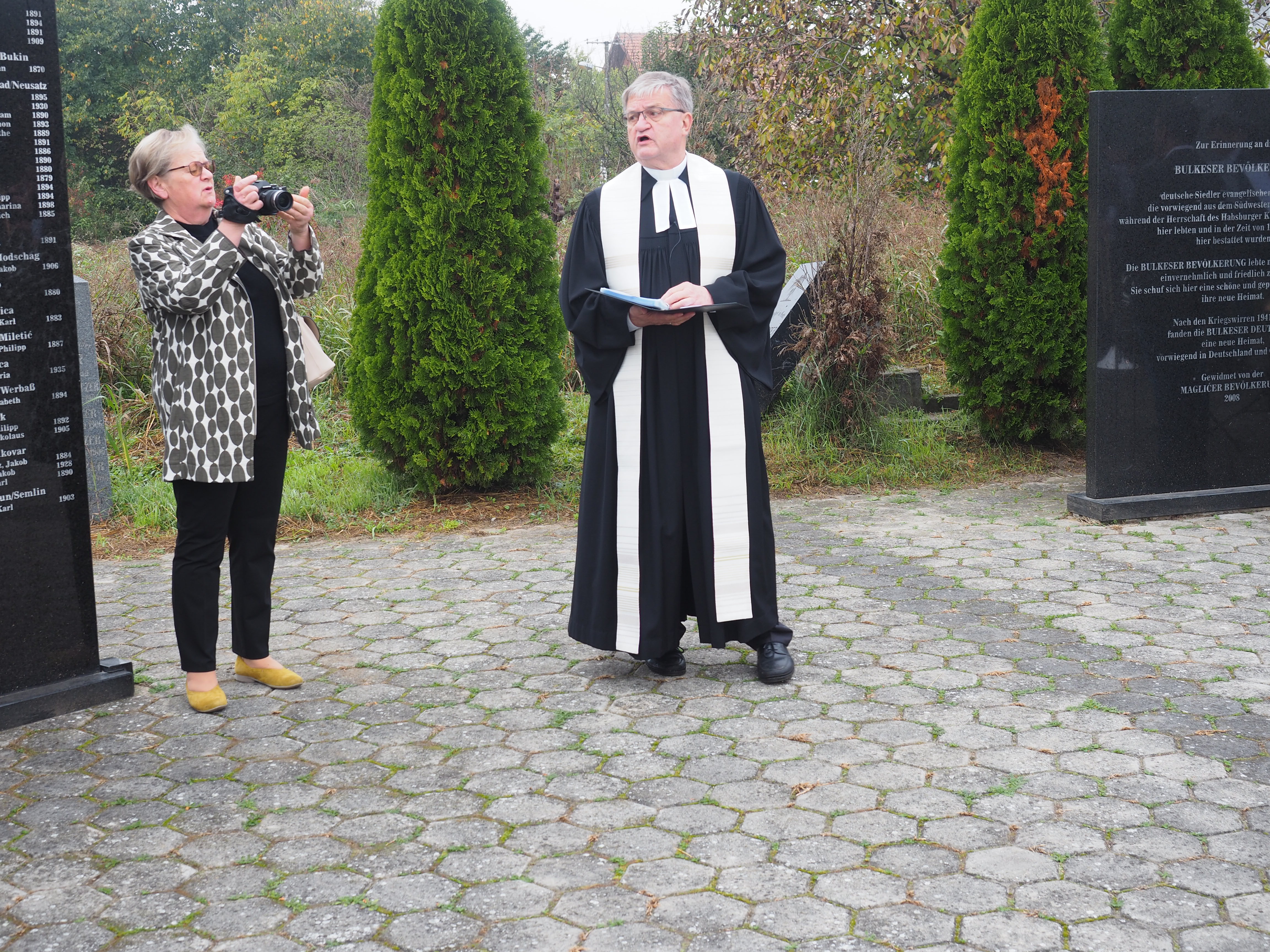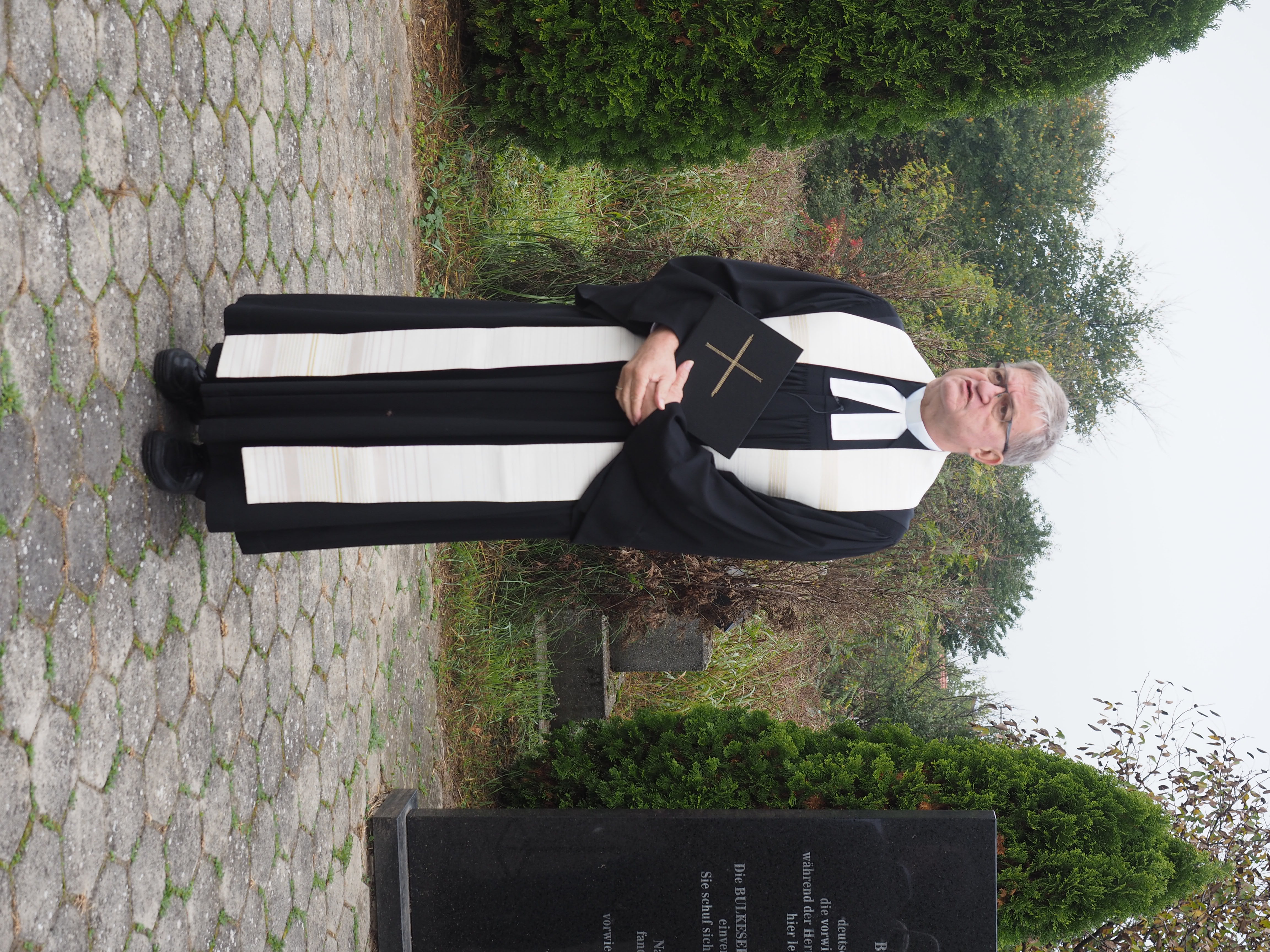 Herr Pfarrer Dr. Lutz Bauer leitet den Gottesdienst an den 2008 errichteten Gedenksteinen für die in Jarek und anderen Lagern verstorbenen Einwohnern von Bulkes