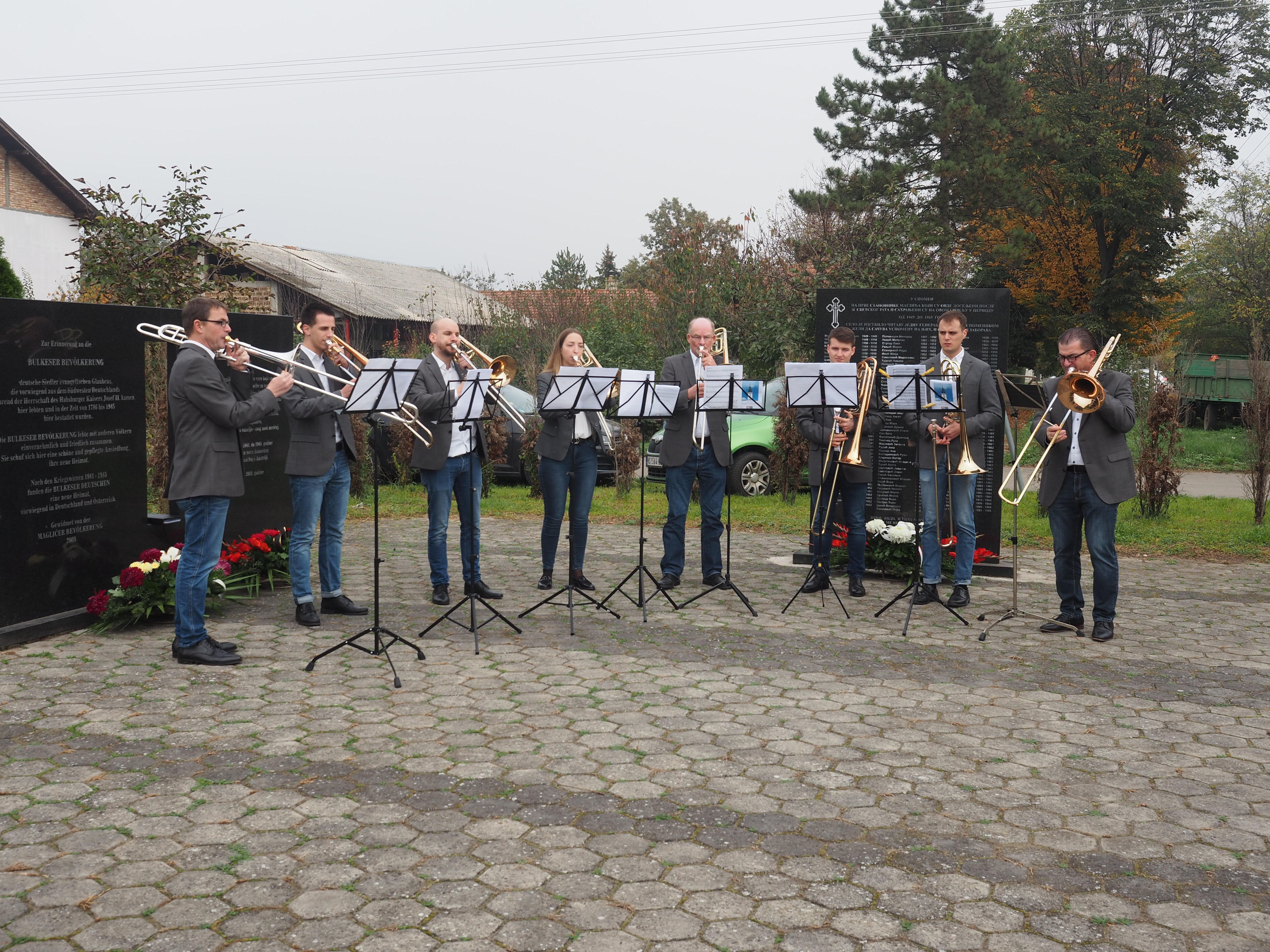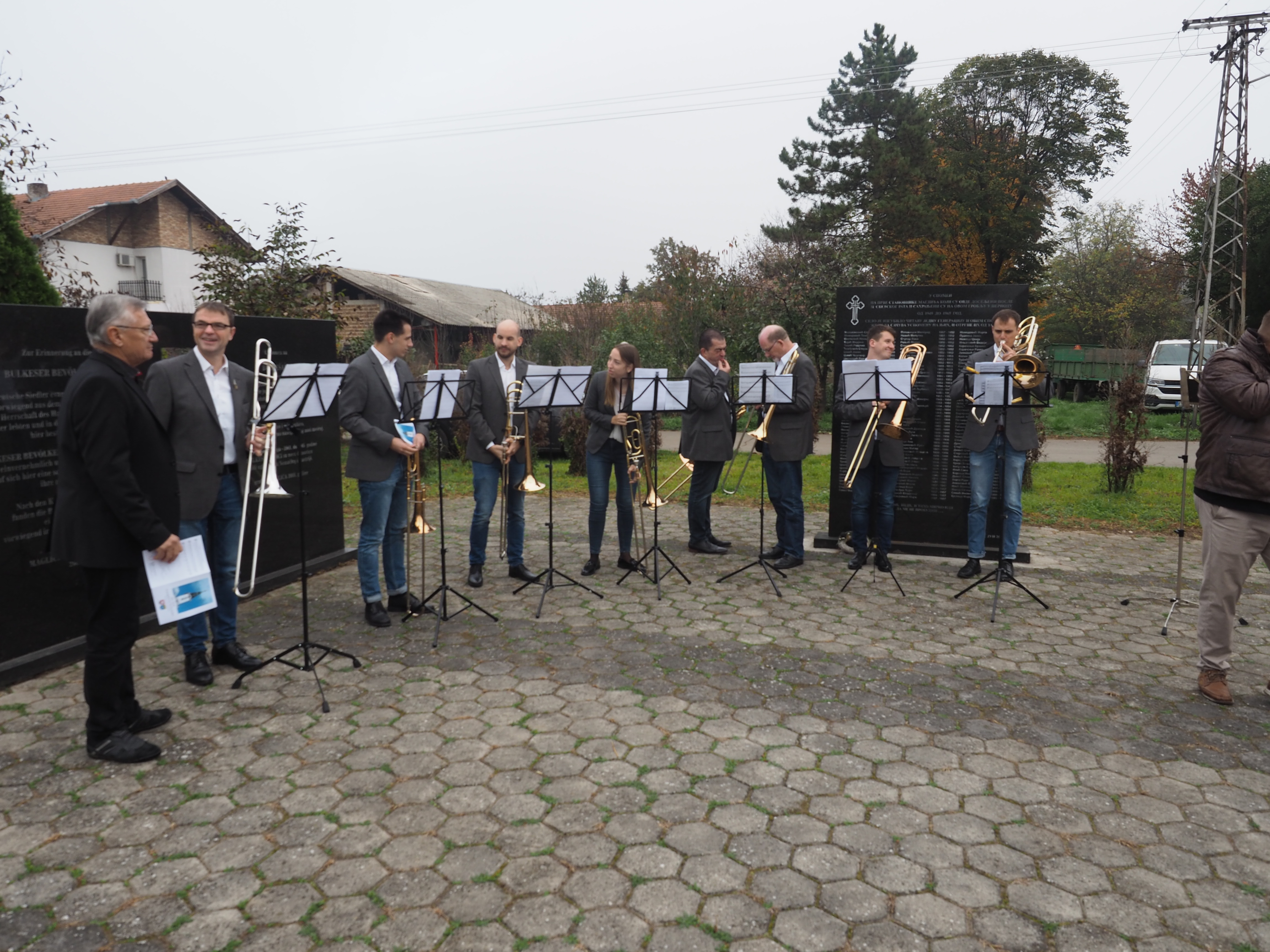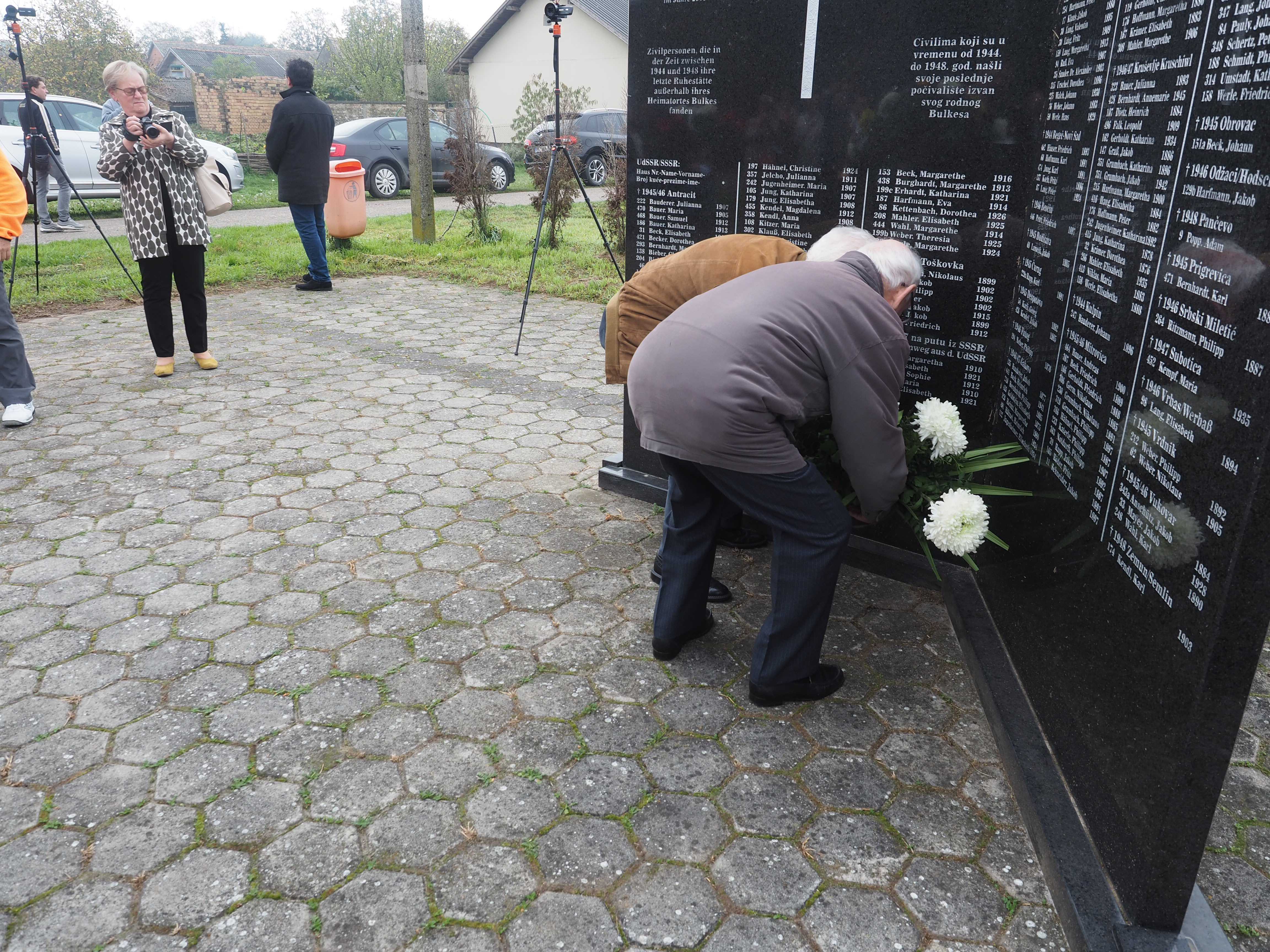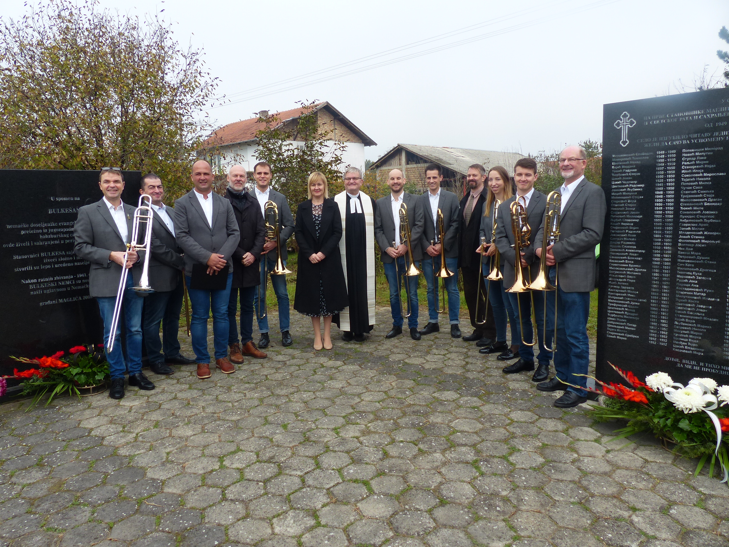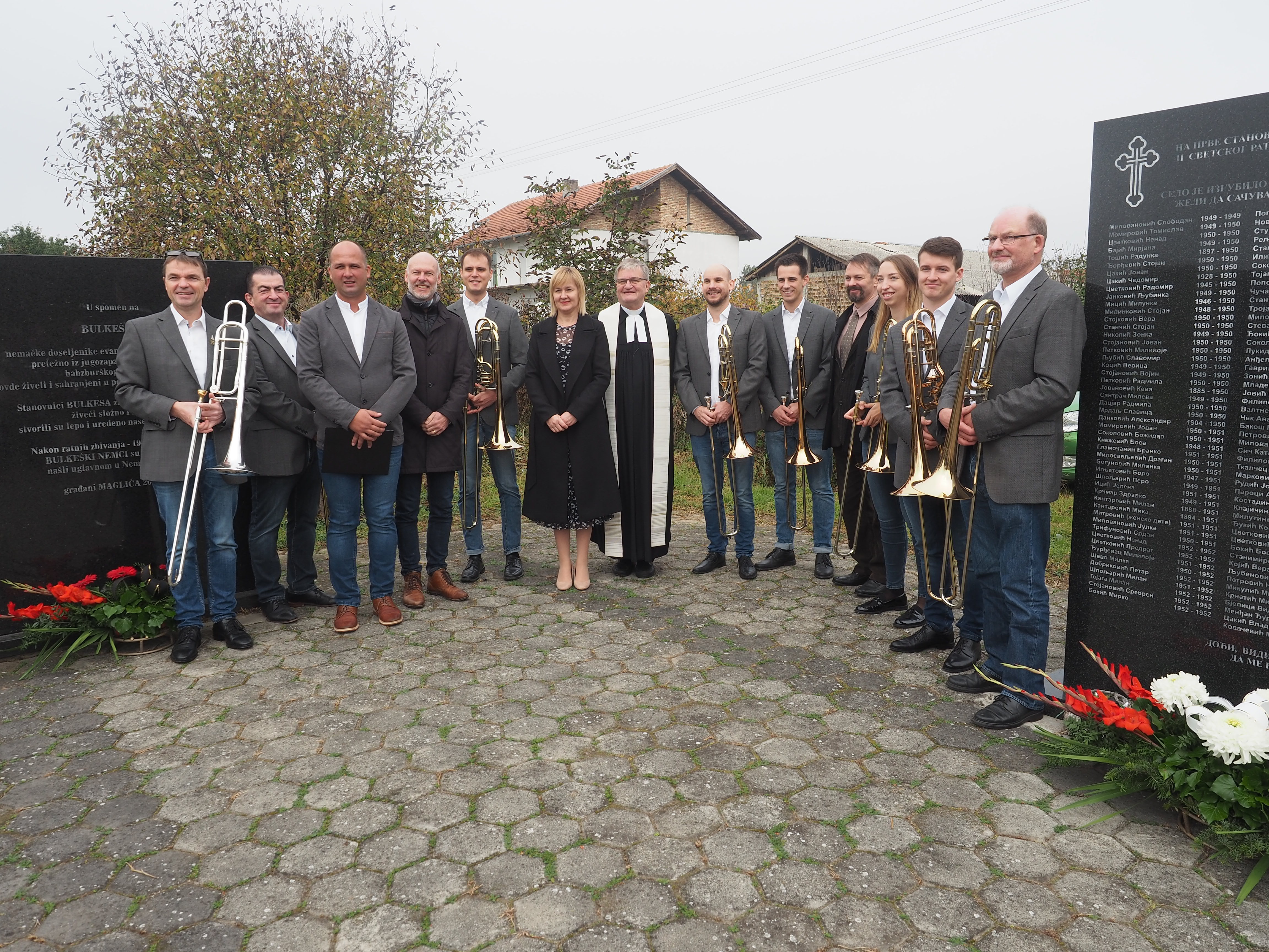 Herr Pfarrer Dr. Lutz Bauer leitet den Gottesdienst an den 2008 errichteten Gedenksteinen für die in Jarek und anderen Lagern verstorbenen Einwohnern von Bulkes