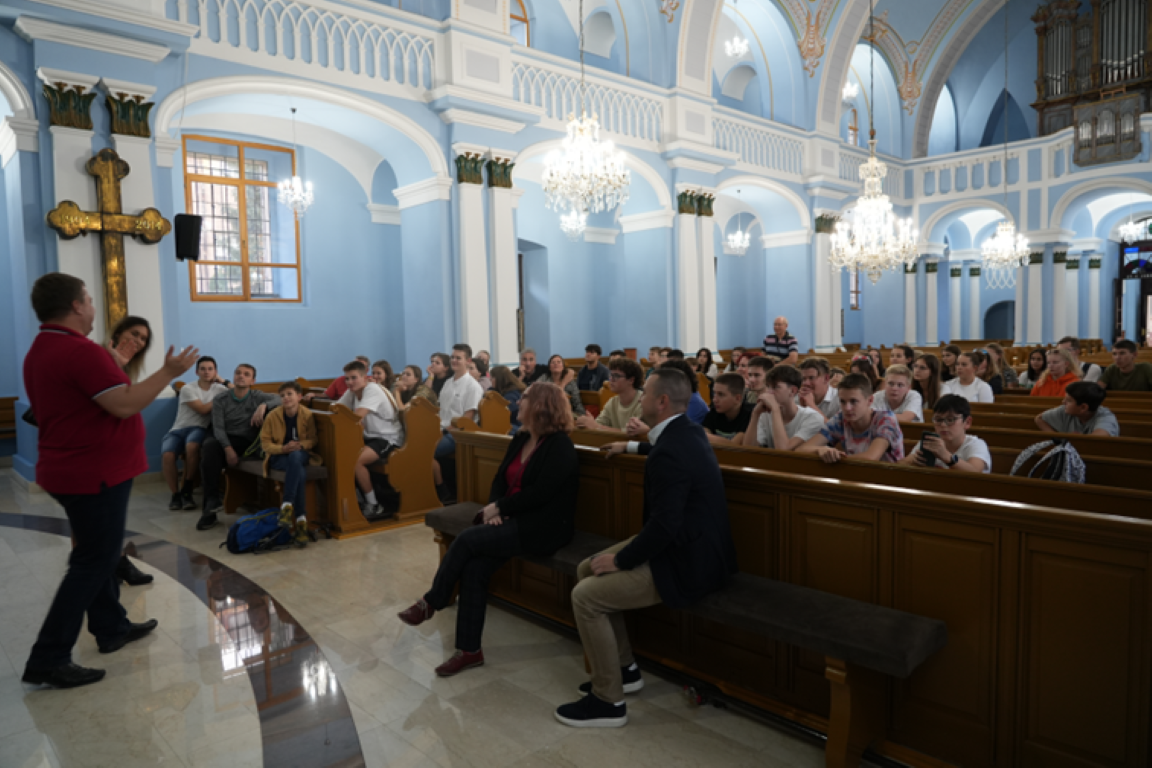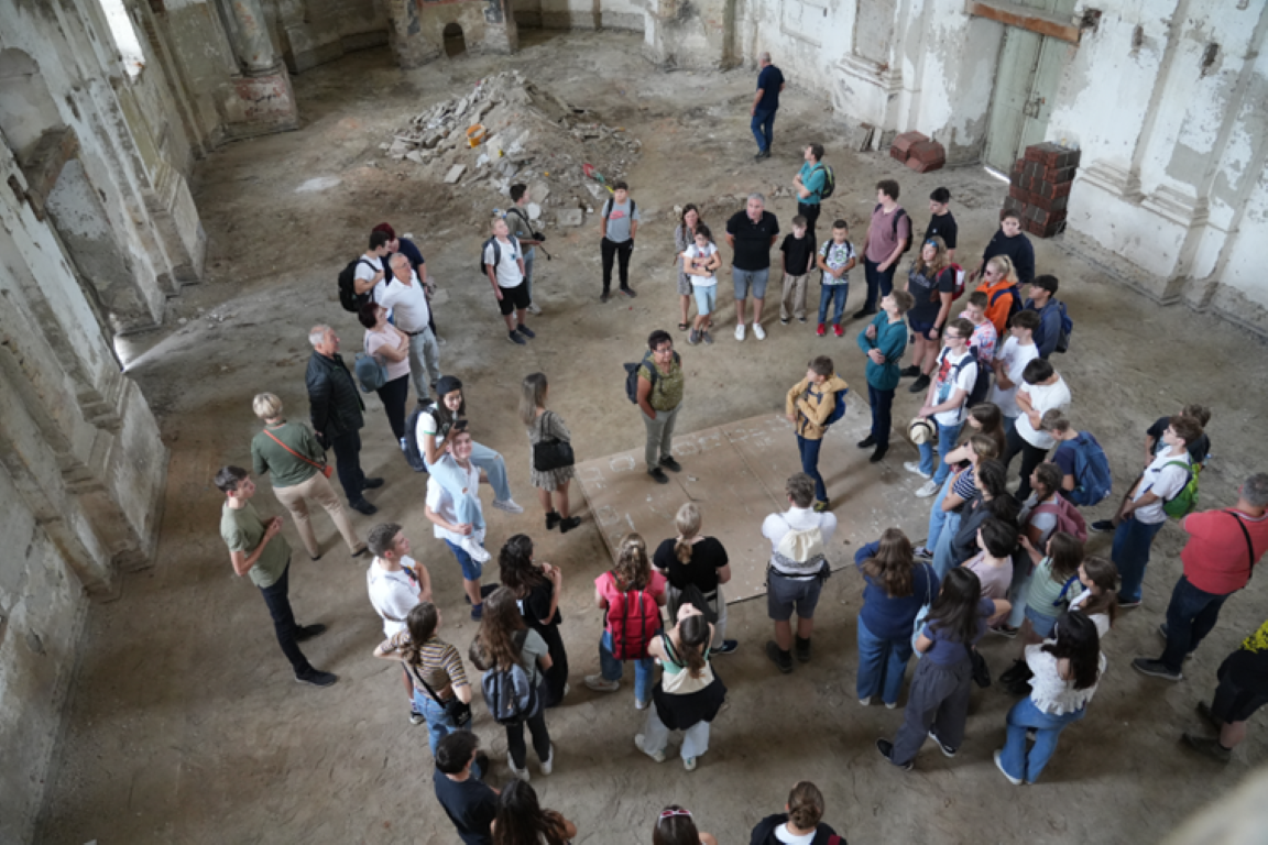Auch die Ausführungen zur deutschen Geschichte des Ortes und dem Schicksal der Donauschwaben folgten die jungen Menschen interessiert. Unsere Gastgeber waren völlig fasziniert von der Disziplin und der sozialen Kompetenz der Gruppe. Am Ende dann noch ein Blick in die ehemalige evangelischen Kirche – von außen bereits schön wieder hergerichtet, aber im Innern noch eine Ruine, für deren Renovierung Bürger von Maglić zusammen mit dem Förderverein Kirchheim-Petrovac nicht nur kämpft, sondern versucht Mittel aufzutreiben. Als Radomir Zotović am Ende des Kirchenbesuches die jungen Leute einlud genau an dieser Stelle in 5 Jahren, wenn die Sanierung geschafft sei, das Eröffnungskonzert zu spielen brandete riesiger Beifall und Jubel auf.