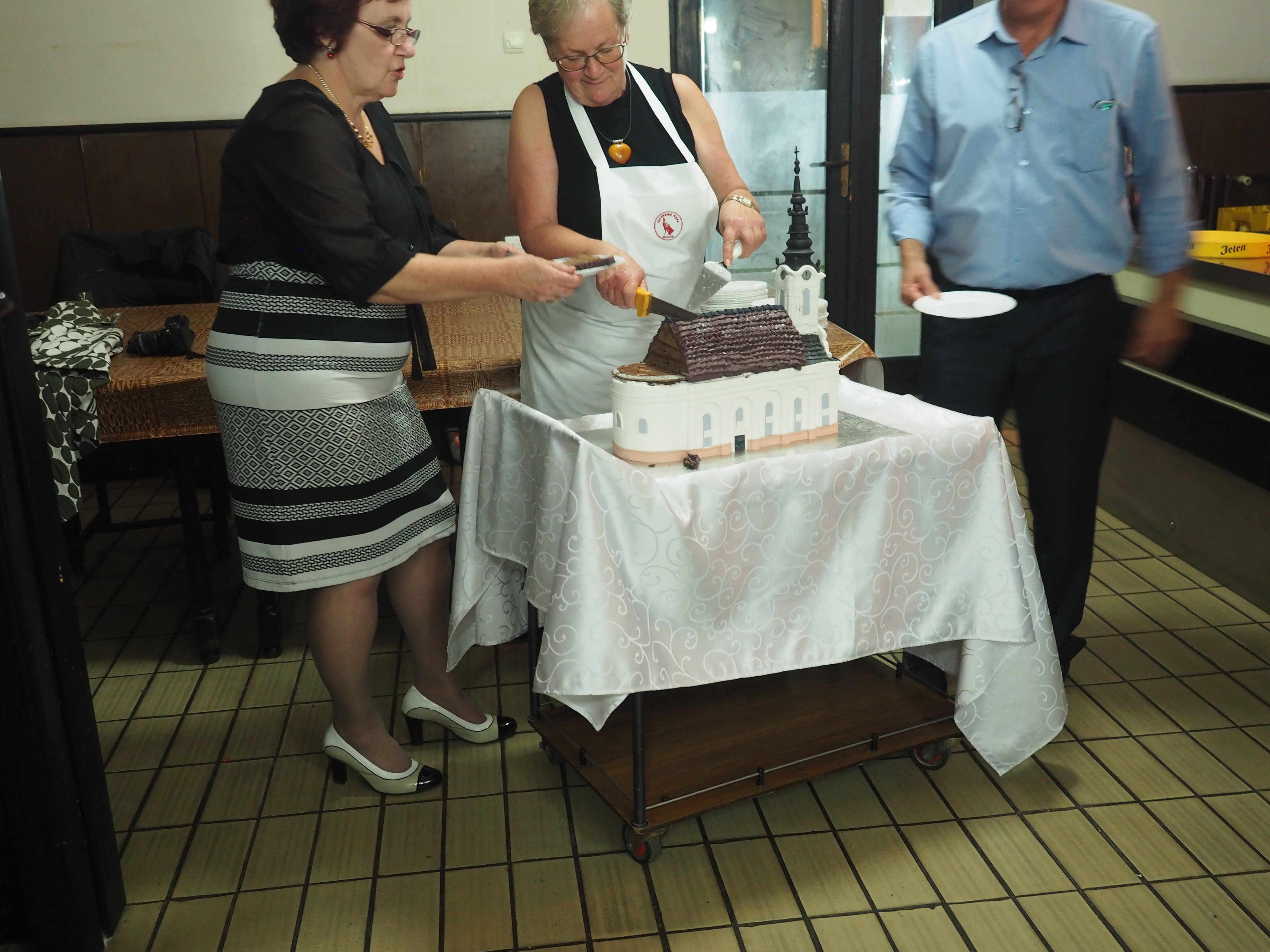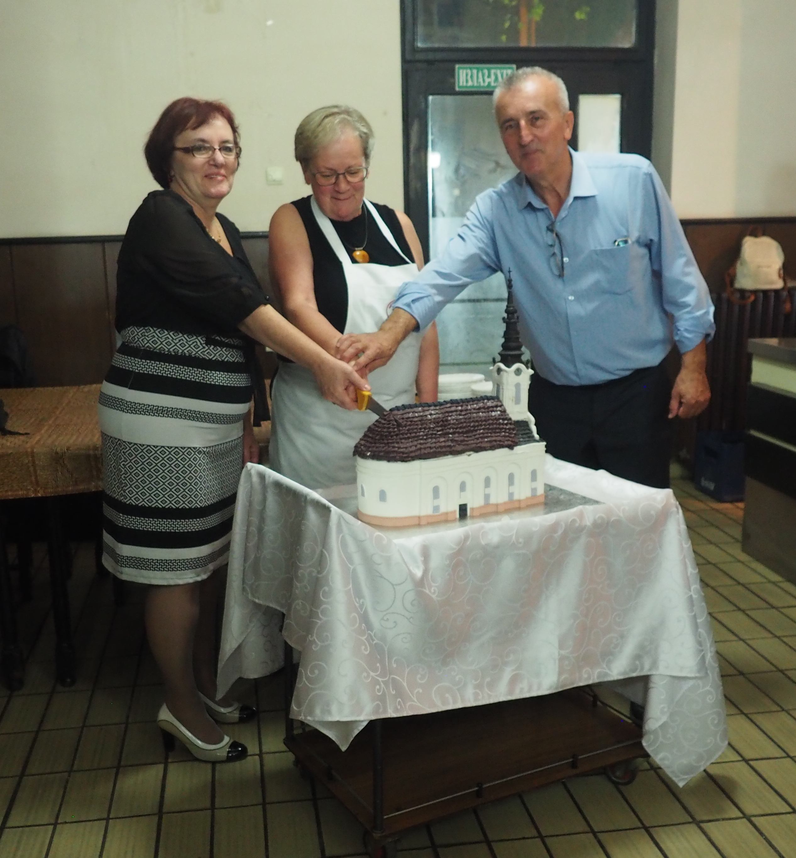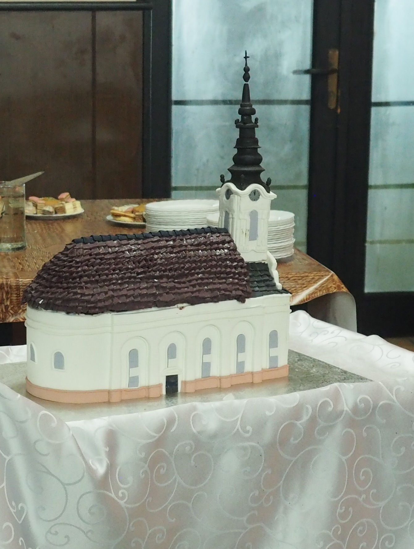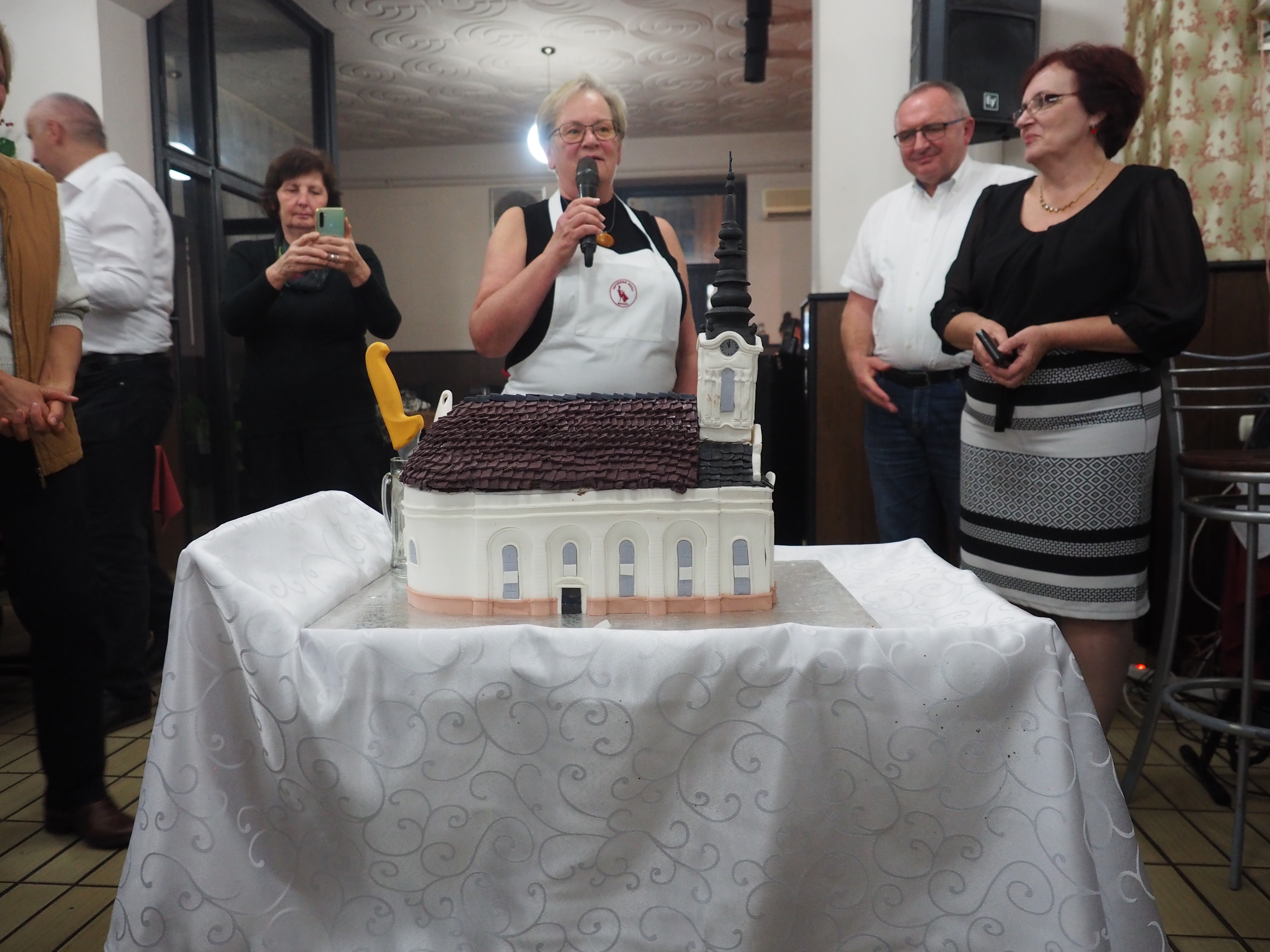 Wir feiern im ehemaligen Pfarrhaus der Kirche. Angelika Rehm und Violeta Cvetković präsentieren den Gästen einen Kuchen in Form des Kirchenbauwerks