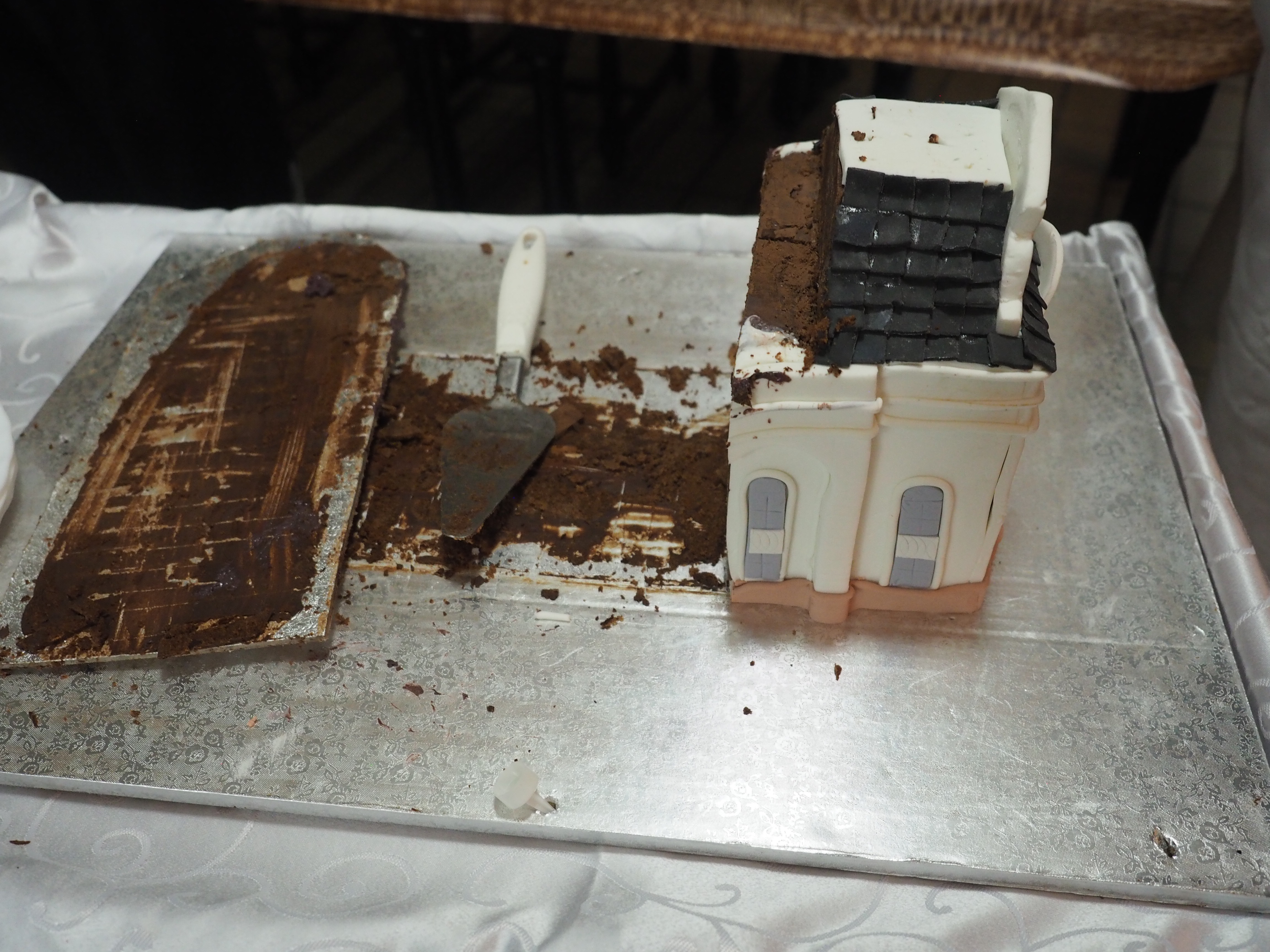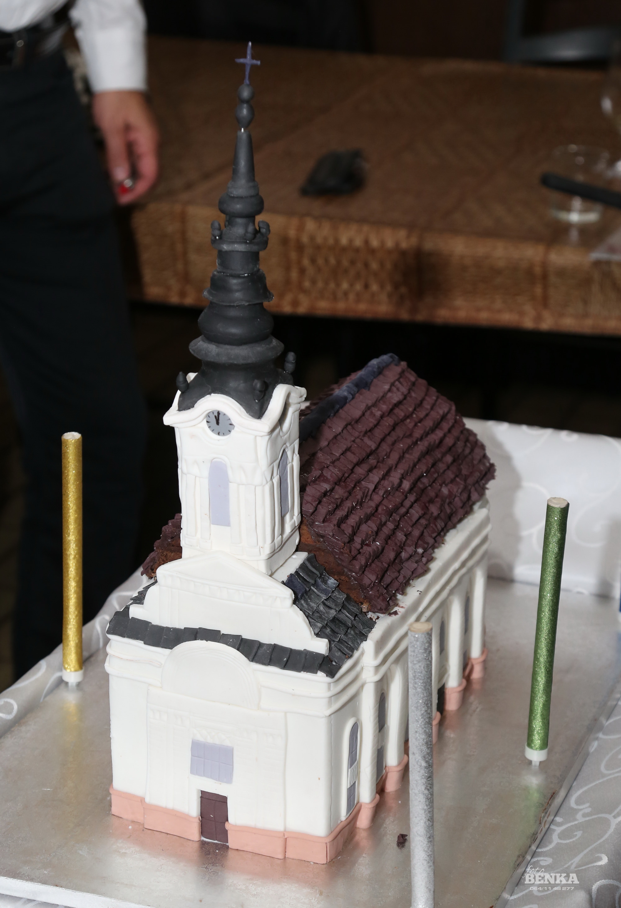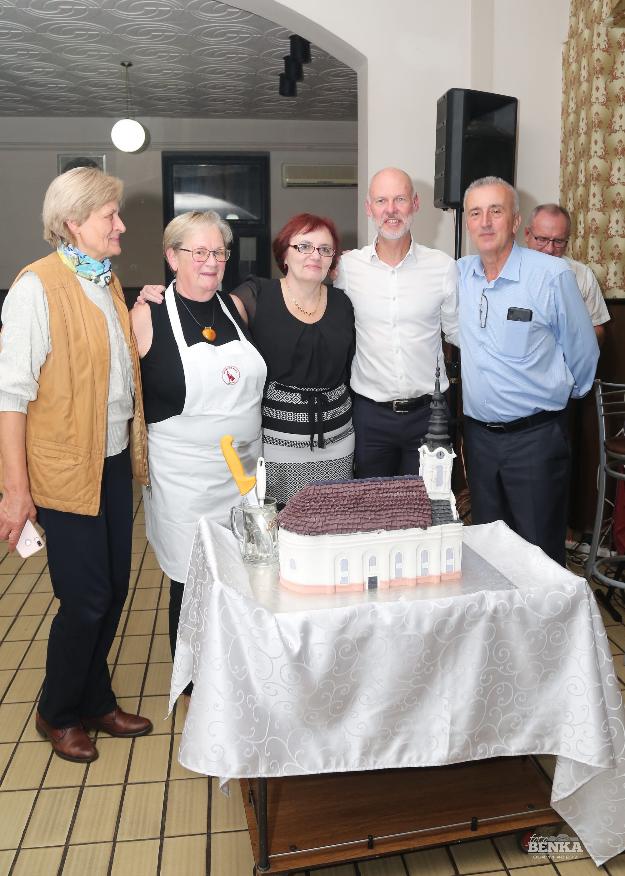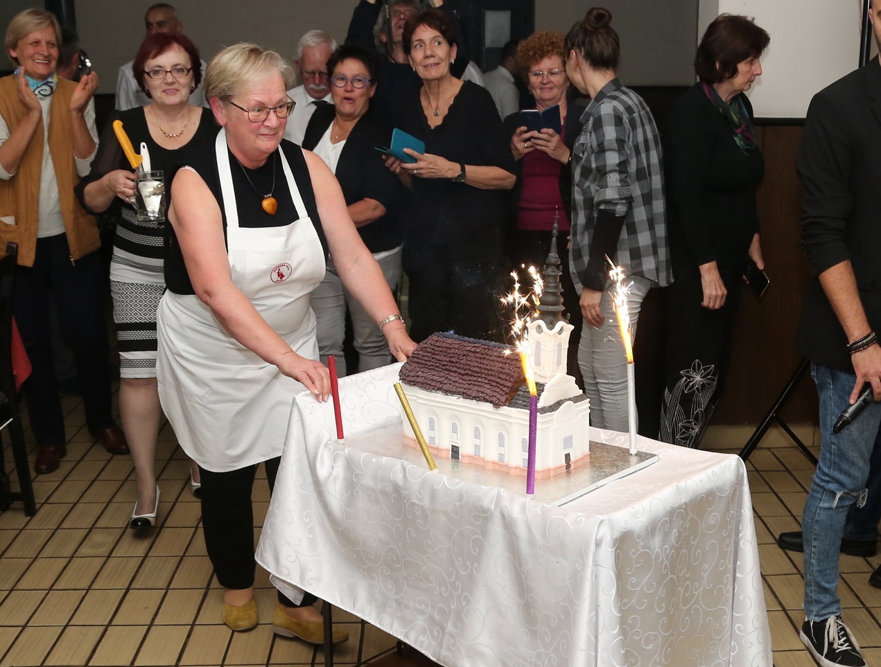 Wir feiern im ehemaligen Pfarrhaus der Kirche. Angelika Rehm und Violeta Cvetković präsentieren den Gästen einen Kuchen in Form des Kirchenbauwerks